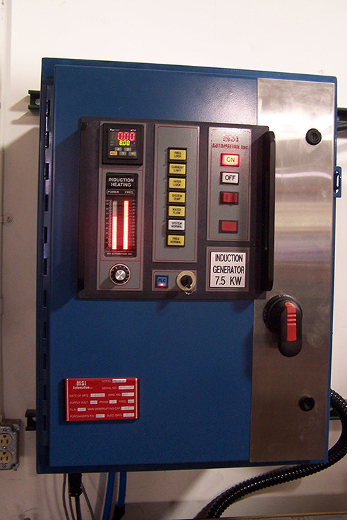 This unit has most of the features of the larger induction systems, but is more compact and certainly useful for laboratory induction heating applications. It can be mounted on a flat laboratory bench, as shown, or mounted in a 19” rack cabinet. The heat station with heating coil is external and can be mounted 3-10 meters from the power supply. Power levels available are 3.0, 5.0 and 7.0 kw.