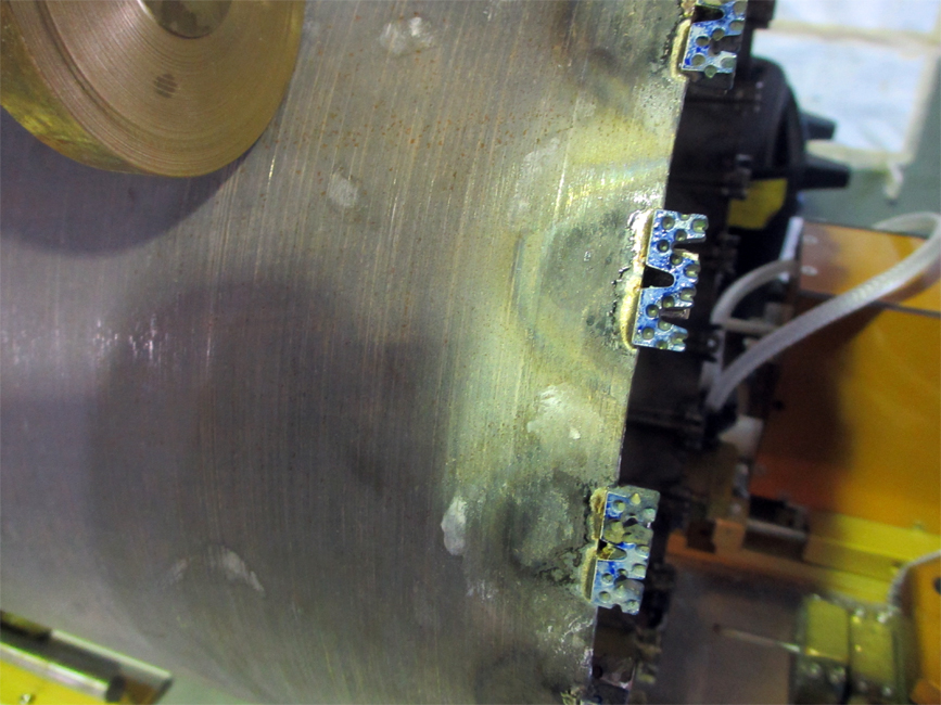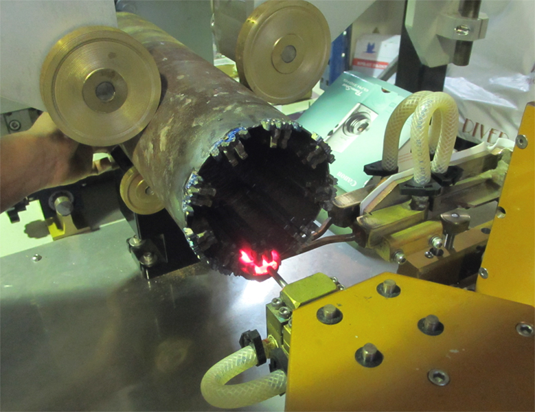 Silver Brazing of the segment is performed by high frequency RF induction heating. (1) Bond strength is very high and superior to torch flame brazing. (2) Since the heat zone can be controlled in a small area, there is less chance of over-heating and damaging the segment�s diamonds. (3) Silver solder consumption is reduced because the silver shim is inserted only between the segment and steel core where greatest bond strength is achieved.