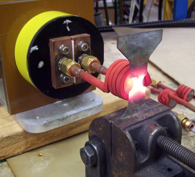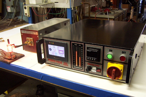This unit has most of the features of the larger induction systems, but is more compact and certainly useful for laboratory induction heating applications. It can be mounted on a flat laboratory bench, as shown, or mounted in a 19" rack cabinet. The heat station with heating coil is external and can be mounted 3-10 meters from the power supply. Power levels available are 3.0, 5.0 and 7.0 kw.